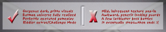 Many of Batman's arch enemies make an appearance through tense boss battles, like the giant, strong-as-an-ox Bane, who rips off and flings heaps of concrete pillars and rams into you with his huge body, waves of thugs lending him a hand. Or Killer Croc, where you sneak on platforms floating above his underwater lair (in order to procure samples to destroy Ivy's mutated plants; they litter the island, firing damaging spores as you pass, and fill the interiors with lethal fumes); slight sounds tip him off to your positions as he breaks your footing or flies out of the water charging. The Scarecrow's creepy visions haunt you intermittently; he stands center within his dreamworld like a lighthouse, forcing you to avoid his searchlight gaze, as he rests his needle fingers on walls and peers over with his giant masked head, or calls his glowing-eyed skeletons to fight you; this intermixes with Bruce's inner fears, as he relives his parents' deaths, or his role switched, he the crazed, Joker the hero. If you're killed, the screen will go black as the offender taunts you in death, but despite being the hunted, it's never too daunting—with Batman's unparalleled skills, they don't stand a chance.