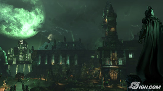 As soon as you step foot in the Arkham Asylum, you're trapped with dozens of freed, crazed inmates, along with the majority of Batman's worst enemies. Because of this, and the island's ruined nature, the atmosphere is dark, gritty and very hostile, a tone set early in by that of the monstrous Killer Croc—"I'll rip you apart. Eat your bones"; everyone has a "bone" to pick with you. Joker and his thugs aren't playing, evident by taunts to newly dead victims, as they talk of "wasting" their families once they're out, and Joker's devil-may-care, mind-game mentality throughout—one thing's clear, Joker is in control; he's the cat, you're the mouse, and devoid Oracle's support by radio, the isolation is palpable. As you navigate the asylum's grounds, the enemy will frequently ambush, surround and mercilessly attack you from all sides in groups of five or over, and they won't wait their turns, hitting all at once. The more clever henchmen will run to nearby walls and pry off lead pipes, then brandish them, or rip off objects and fling them at you—both of which temporarily triple your vision if hit.