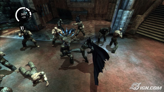 You'll be combating Joker's Blackgate Henchmen (who fight with their fists—later with pipes, knives and stun batons; in stealth portions, guns), mutated Henchmen on Titan serum; asylum Lunatics; Poison Ivy's spore-shooting plant pods, and poison-controlled asylum guards, along with many of Batman's arch enemies throughout, from Bane to Harley Quinn, Killer Croc, Poison Ivy, Scarecrow, and the Joker himself. The combat system is moderately brutal, and consists of you using Batman's devastating punches, kicks, elbow, knee, and counter moves to combat surrounding enemies. After wearing one down, Batman will perform a standing finisher—as the camera zooms in and goes into slow-mo—where you see and hear a variety of his audibly bone-crunching moves (if they're armed, he'll use their lead pipes against them) as they ragdoll to the floor, holding their arms in defensive positions; and he'll straddle fallen thugs, then lift and slam their heads to the floor. Batman can also use his Batarangs and Explosive Gel to stun them, or sneak up and non-lethally choke them. But all is bloodless, and (devoid Ivy's plants) Batman does not kill—he just beats them unconscious.