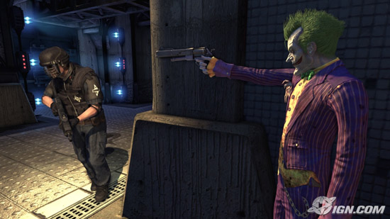 Blood: When Batman is shot in close-quarters by enemy weapons, he appears to shed a light cloud of the substance—otherwise there is no blood in gameplay. There is light to moderate amounts of dark, muddied, pre-existing blood splattered and speckled on walls and floors throughout; at one point you use the blood coming from the Warden's injured face to track him—after saving him and (later) Gordon, both have bloody cuts on their faces—near the end, Batman has a ragged appearance, including a few bloody cuts on his face, and several areas of the asylum have IV machines with what appears to be bright red blood flowing within; nothing is attached to said devices. Unconscious enemy bodies do linger—Batman does not kill—and there are many dead (unbloodied) asylum guard and staff bodies scattered throughout, as well as a dead guard—victim of Joker's toxin—strapped to a dolly; lifeless eyes staring in terror, his face forced into a wide grin; and at one point, a group of skeletal remains.