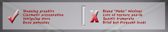 This element also plays into your actions, and you're often given the choice on some pretty tough moral issues, which are less black and white, making them much tougher to differentiate between plain good and bad. Depending on what you choose, you'll get points that are added to either the Paragon bar (good) or Renagade bar (bad). This system affects everything, and ultimately shapes the story; from influencing people in your party, relationships, missions, to the overall ending (as there's more than one). The combat system is in real-time, and you're equipped with a pistol, rifle, shotgun, and sniper rifle, and later on you gain force-like powers, which enable you to throw and lift enemies with your mind and protect yourself with a mind-projected field. And although the combat is intense and hectic, there's a minimal amount of blood, enemy bodies stay in one piece, and since you and the enemy are in full, energy-shielded armour and use guns that shoot energy beams, combat isn't nearly gratuitous. And to top it all off, although you do fight many organic (alien/human—very rarely human) enemies, your main enemy is the Geth, which are a robotic species, and many of the remaining enemies are some form of machine.