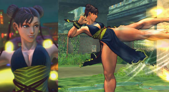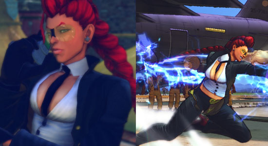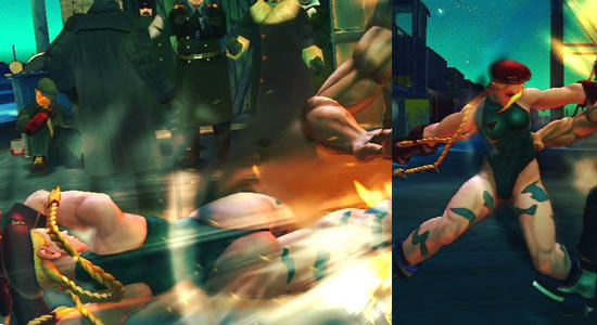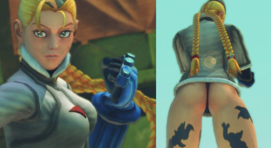 Cammy's (who is unlocked after completing Crimson Viper's Arcade story) nearly bare behind is often shown during her fight introduction, with the camera focusing on it as her back is turned. And each of the aforementioned female character's animated story intro counterparts have even larger busts (although they—and their busts—are very briefly shown, as their scenes are only 1-2 minutes). Breast physics are present but subdued, and are only lightly evident as the female characters bounce in place in a somewhat provocative fashion—especially in Cammy's case—and it's more noticeable when they are wearing their alternate and lighter costume colors.