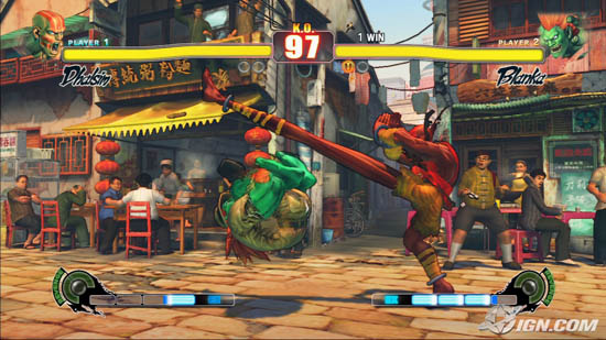 As the characters are attacked, they'll lightly grunt and groan, and when they've been sapped of their health, they'll fly in slow-motion while they fall to the ground (female characters will often let out a high-pitched scream). Characters can taunt each other, but the worst you'll see is the flamboyant Dan, bending down and shaking his behind in a comical manner, and the Hulk-like Blanka, scratching his. Lastly, there are a few bizarre characters, notably Dhalsim, a bald Yoga master, who uses his powers to float around, and his super flexible limbs to attack "Mr. Fantastic" style; a character named Vega uses a large, hand-strapped claw to attack, causing mild (bloodless) swishing sounds on impact; the green, Hulk-like Blanka will sometimes try to (non-graphically) chew on opponents' necks; and there's some mildly hectic activity going on in some of the arenas' backgrounds (soldiers will fire off shots into the air as they cheer you on, etc.)—but the overall tone is cartoony, over-the-top and even quite comical.